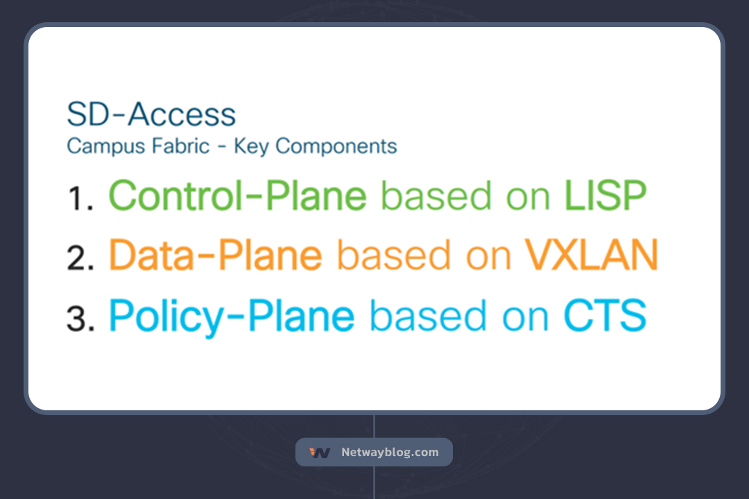 • Control Plane: مسئول پیام رسانی و پروتکل ارتباطی بین دستگاه های زیرساختی در Fabric است. در SD-Access،  Control Plane بر اساس پروتکل Locator/ID Separation Protocol (LISP) عمل میکند.