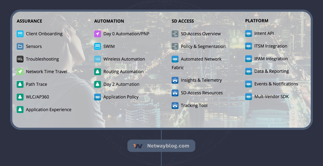 محصول Cisco DNA Center یک پلتفرم مدیریت شبکه است که به سازمان‌ها در مدیریت، اتوماسیون و عیب‌یابی شبکه خود کمک می‌کند. این پلتفرم بر اساس رویکرد Zero Touch Provisioning (ZTP) است که به سازمان‌ها امکان می‌دهد دستگاه‌های شبکه خود را بدون نیاز به دخالت نیروی انسانی پیکربندی کنند. Cisco DNA Center همچنین از هوش مصنوعی و یادگیری ماشین برای تجزیه و تحلیل داده‌های شبکه و شناسایی مشکلات استفاده می‌کند. این محصول قلب تپنده زیرساخت SD-Access سیسکو میباشد.