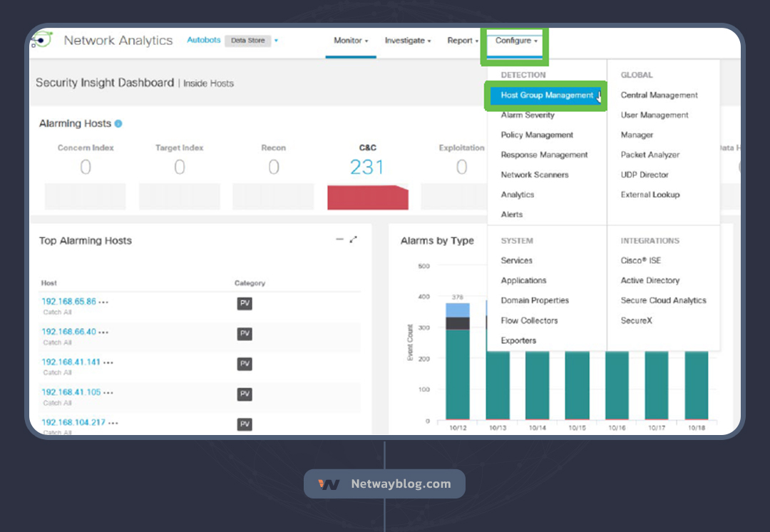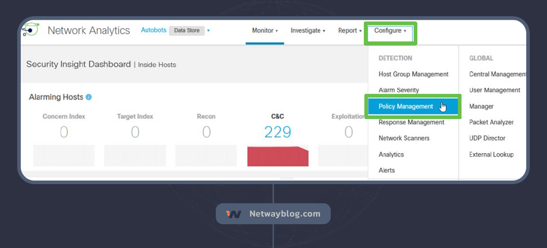 برای پیکربندی رویداد امنیتی Host Beaconing، از داشبورد Security Insight Manager در Secure Network Analytics، گزینه Configure را انتخاب کرده و Policy Management را انتخاب کنید.