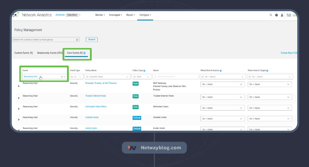 تمام سیاستهایی که این رویداد امنیتی را دارند نمایش داده میشوند. مطمئن شوید که رویداد Host Beaconing در سیاست پیشفرض پیکربندی شده برای گروه میزبان Inside Hosts در ستونهای Source و Target روی On + Alarm تنظیم شده است.