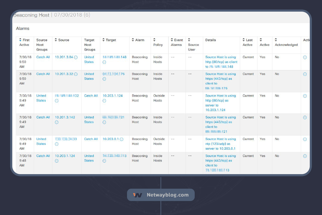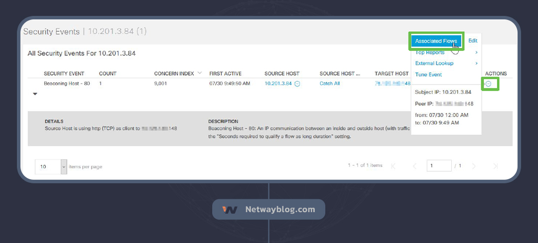برای تشخیص این تهدیدات، از رویداد امنیتی Host Beaconing استفاده کنید که ترافیک یکطرفه بین گروههای میزبان Inside Hosts و Outside Hosts را در طول 9 ساعت (قابل پیکربندی) تشخیص میدهد.