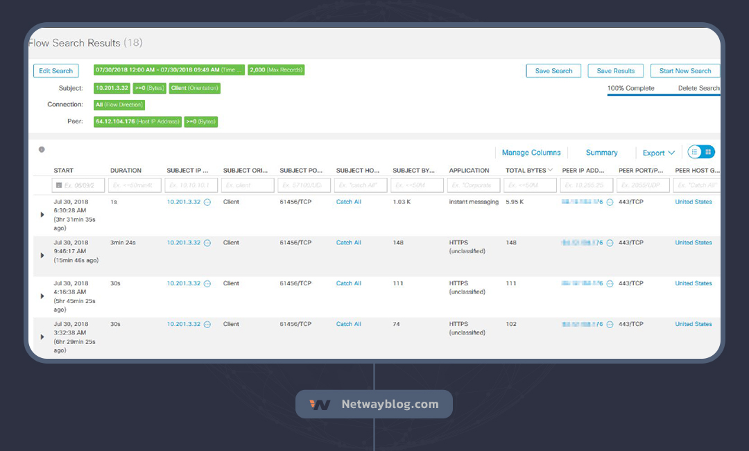یک جستجوی Flow با معیارهای از پیش پر شده نمایش داده میشود. ما چندین مورد ترافیک یکطرفه روی پورت 443/TCP به گروه میزبان Outside Hosts را مشاهده میکنیم. این میتواند نشان دهنده یک میزبان آلوده باشد که با یک سرور C&C ارتباط برقرار میکند.