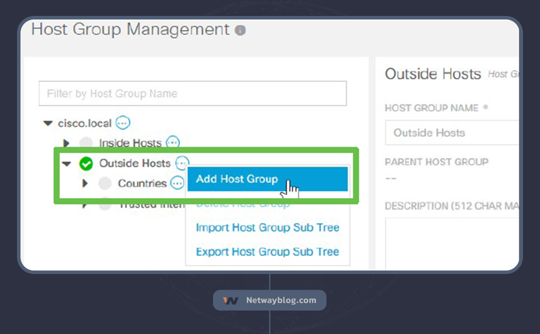 گروه میزبان Outside Hosts را انتخاب کرده، روی علامت سه نقطه کلیک کرده و گزینه Add Host Group را انتخاب کنید.