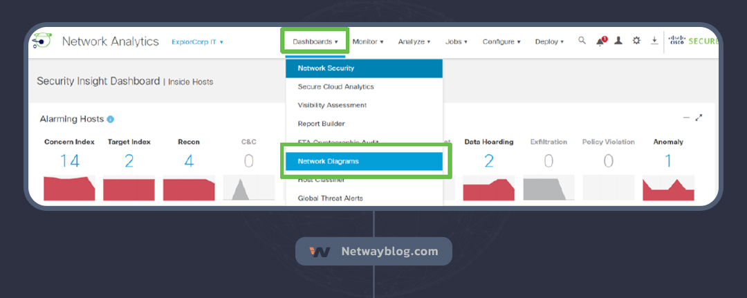 سادهترین راه برای دیدن اینکه چه میزبانها یا سیستمهایی بیشترین پهنای باند را بین گروهها مصرف میکنند، استفاده از برنامه Network Diagrams است. برای رفتن به برنامه Network Diagrams، روی Dashboards کلیک کنید و سپس Network Diagrams را انتخاب کنید.
