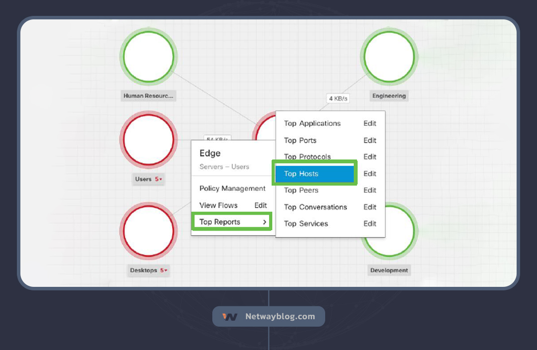 در این مثال، ما به دنبال یک میزبان هستیم که بیشترین ترافیک را بین گروه میزبان Users و گروه میزبان Servers مصرف میکند. روی خط بین این دو گروه راست کلیک کنید و گزینه Top Reports > Top Hosts را انتخاب کنید.