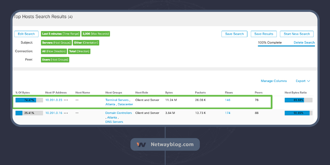 صفحه Top Hosts Search Results با میزبانهای برتر بین این دو گروه میزبان نمایش داده میشود. جدول بر اساس میزبان با بیشترین مصرف پهنای باند مرتب شده است.