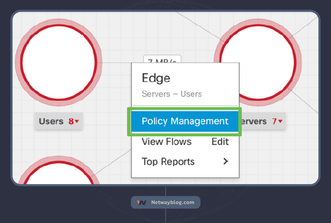 شما میتوانید از Relationship Policies برای تشخیص پیشگیرانه استفاده کنید. در برنامه Network Diagrams، روی خط بین دو گروه میزبان راست کلیک کنید و Policy Management را انتخاب کنید.