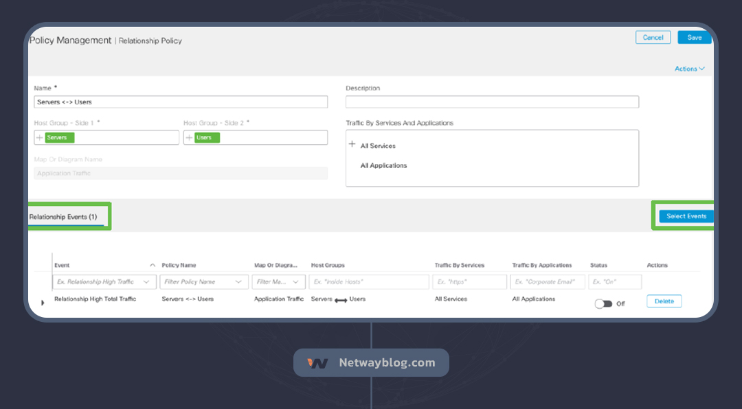 صفحه Policy Management با یک سیاست ارتباطی جدید، خودکار و از پیش فیلتر شده توسط گروههای میزبان مرتبط نمایش داده میشود. در بخش Relationship Events، میتوانید هشدارهایی را که میخواهید این سیاست بر آنها عمل کند، سفارشی کنید. روی Select Events کلیک کنید.