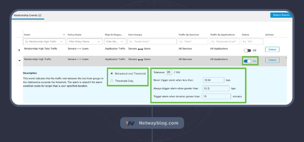 یک بار که هر یک از این رویدادها فعال شد، میتوانید آنها را برای استفاده از یک مکانیسم راهاندازی Behavioral Threshold یا یک مکانیسم راهاندازی Threshold Only پیکربندی کنید. برای هر یک از این روشها، باید مقادیر مصرف پهنای باند و مدت زمان تعریف شوند تا چه زمانی که هشدار راهاندازی شود و زمانی که هشدار راهاندازی نشود. این مقادیر در هر محیط و پروفایل شبکه متفاوت خواهد بود.